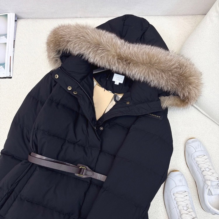 Burberry new hooded long down jacket with fur collar and zipper closure-5351