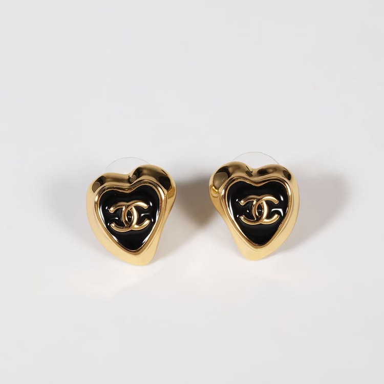 Chanel black enamel love double C gold edge earrings-3739