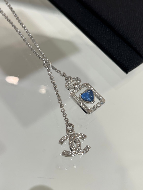 Chanel blue heart silver full diamond double C perfume bottle necklace-3750