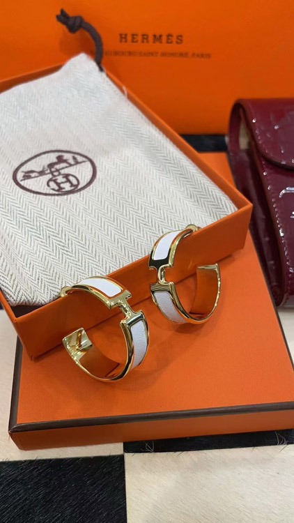 Hermès metal H letter white leather earrings-3714